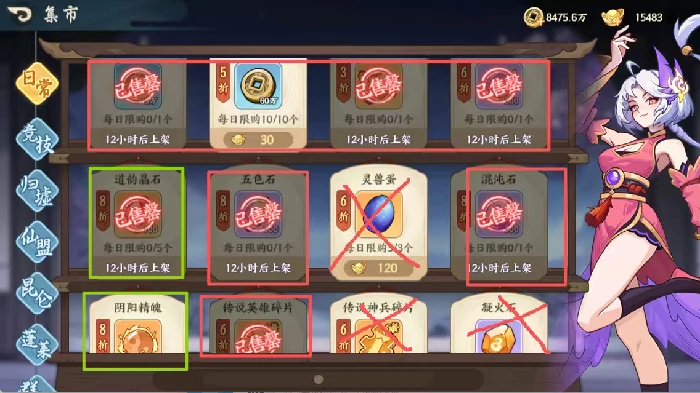 标叉号物品不兑换;红框物品必买,绿框物品尽量买(尤其道韵晶石),每日购买活动间隔期可积累约500抽