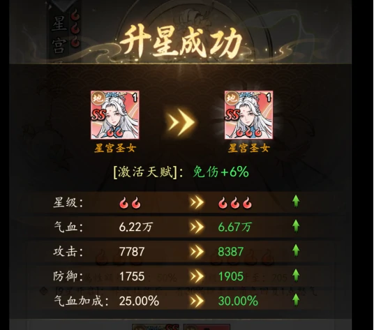 例如:星宫圣女8星解锁免伤+6%。建议提升星级最大化战斗表现,解锁更多天赋加成。