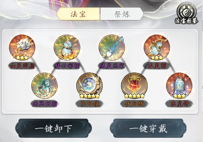 伙伴星级提高,解锁更多法宝栏位。法宝升星增强属性,收集法宝提升法宝库等级,激活全局属性增益。