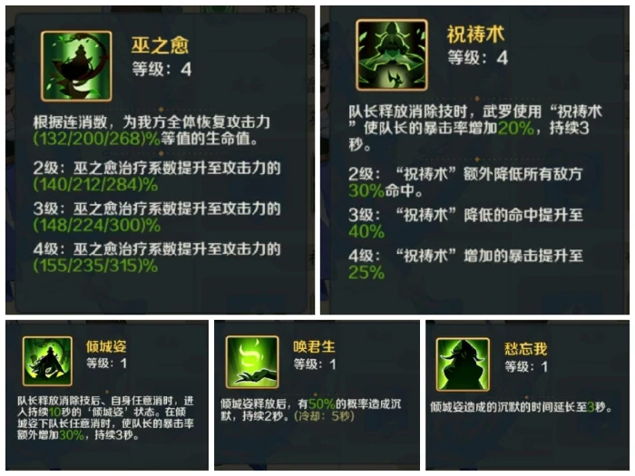 武罗:执行辅助治疗与控制。发动消除技为全队回复生命,启用核心技与神兵技能提升队长暴击率、降低敌人命中,施加沉默控制。保障核心输出生存,提供控场与增益支持。