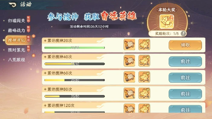 搜神台抽卡,完成对应任务额外获搜神画卷及传说英雄。