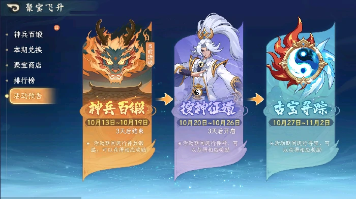 每七天轮换活动内容,通过寻宝、锻造或搜神获取奖励,飞升令兑换封神榜、乾坤袖、自选红色装备等珍贵物品。