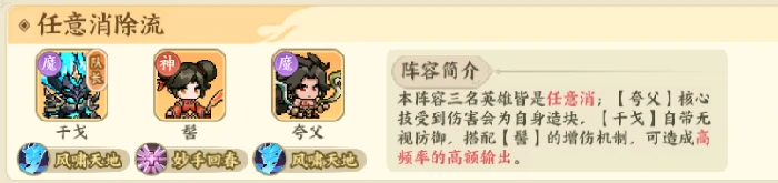 阵容概述:夸父分摊伤害,提供控制与群体治疗;干戈自带暴击与破防,搭配髻女神全程增伤,保持稳定输出。阵容兼顾生存与伤害。