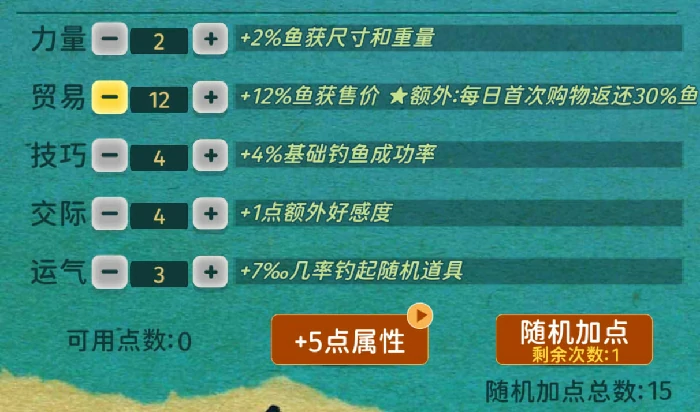 进入游戏,先用随机加点,直至总属性≥13点,否则重启(观看满8次广告可忽略)。关键属性贸易,需≥10点,15点最佳(看广告玩家优先加满贸易与运气)。确认属性,开始游戏。
