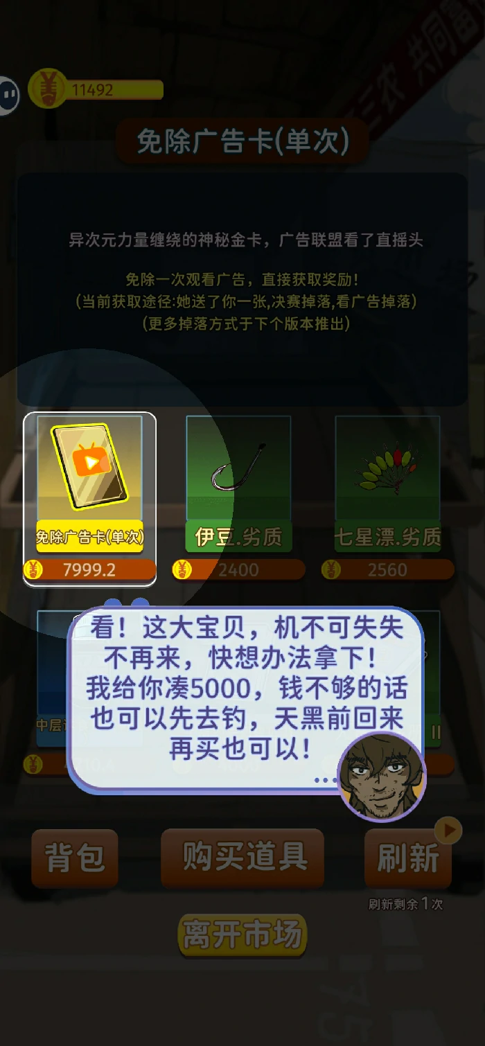 完成6次垂钓,不点击事件按钮(避免自动进入下一天)。返回营地,进商店。NPC赠5000鱼币,加自赚3000余鱼币,购买免广卡。