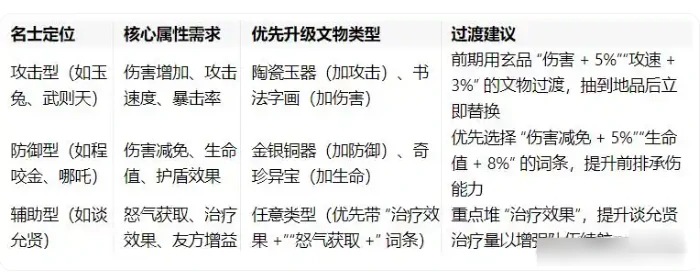 升级思路:前期文物获取难,已装备地品文物平均升至10级,激活首条特殊属性。后期得毕业级词条文物(如攻击型名士用伤害+15%、攻速+10%),优先强化。