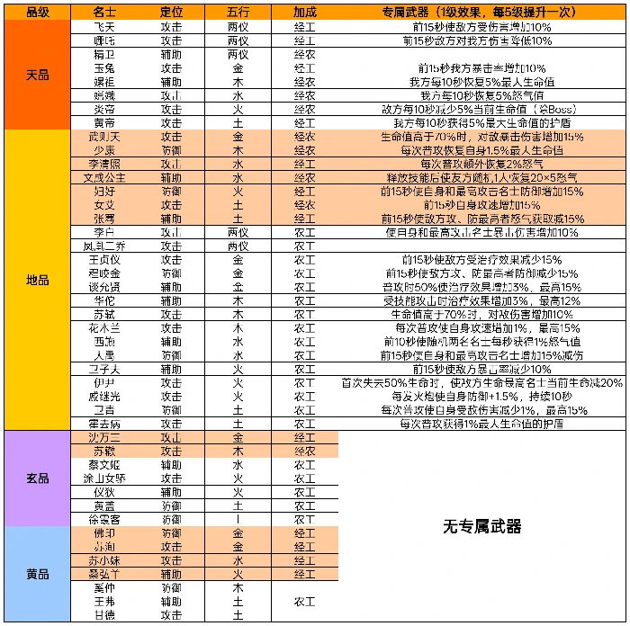 当前版本首选金系、火系队伍,强度在线适合多数人。土系偏弱别碰,木系、水系得高星名士撑着,资源多的玩家再考虑,低投入玩起来费劲。