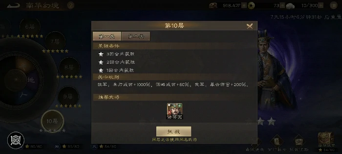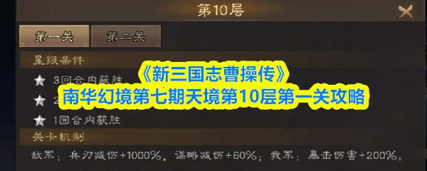 南华幻境第七期天境10-1关卡机制:敌军兵刃减伤极高、谋略减伤较高,我军暴击伤害大幅提升,诸葛亮为核心输出。