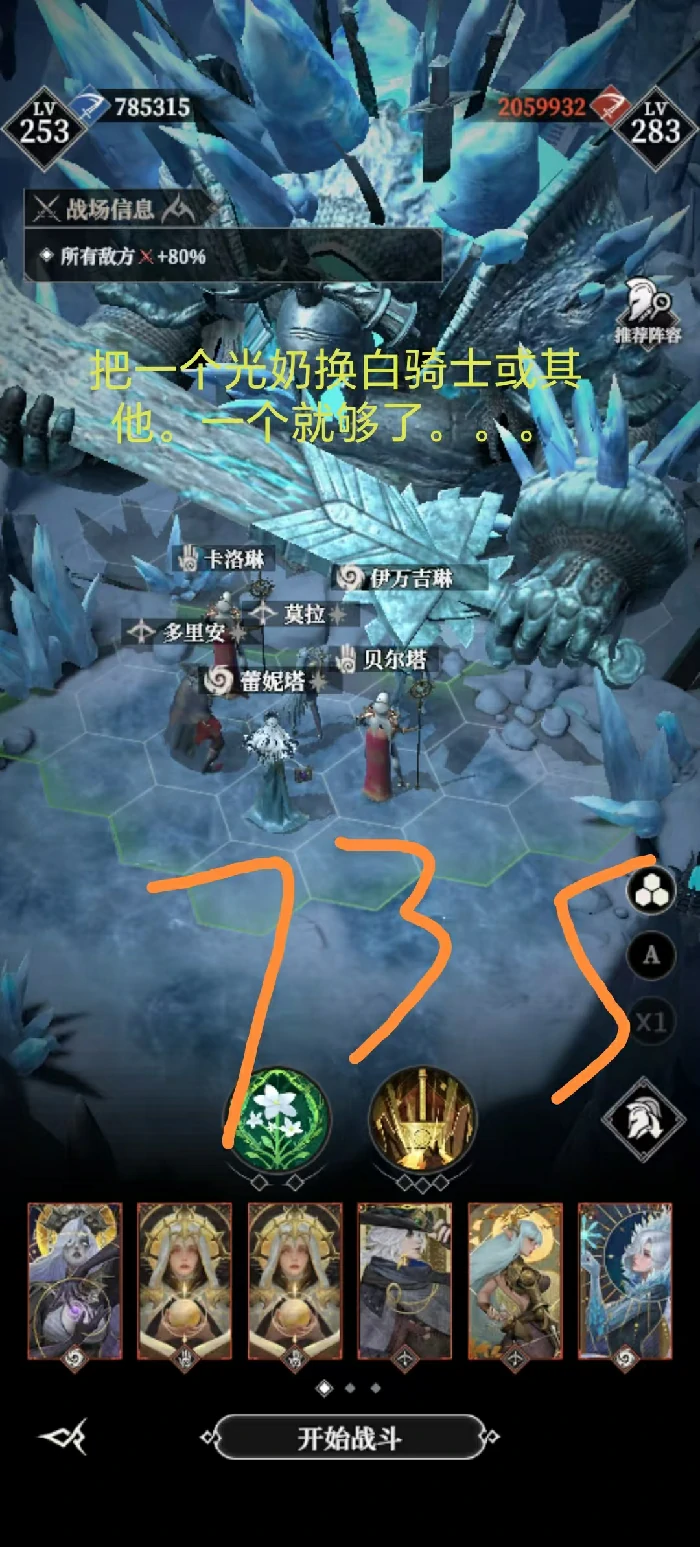 阵容配置:冰法穿吸血套装,减速并输出;莫拉配吸血套装与氪金弓,削减能量并补充伤害;白骑士用吸血套装,主打攻击与持续伤害(可替换其他输出);骨女、迅矢和光奶统一配置能量套装。近战、弓手、法师三套吸血装可完整分配,装备不足可用能量套替代。