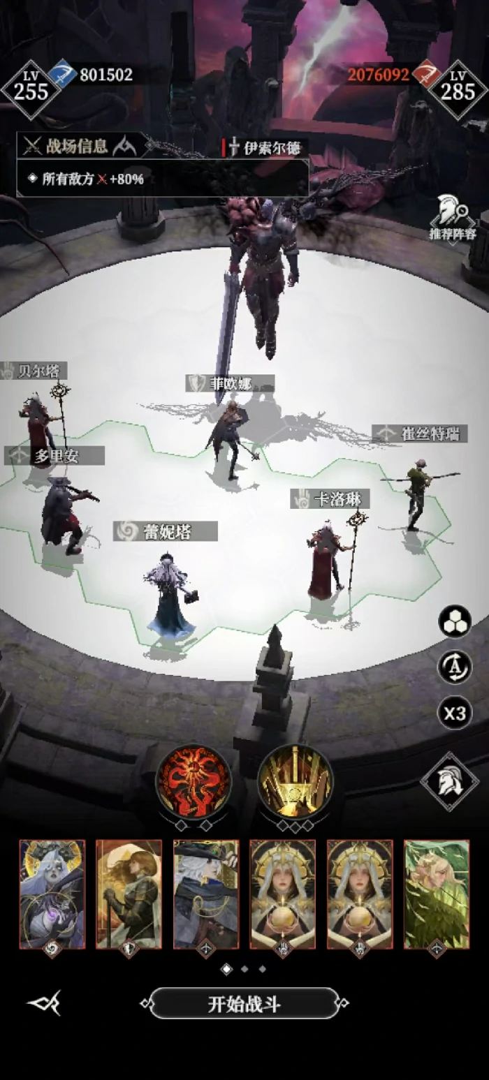 阵容调整:原右侧用带亵渎戒指的海伦娜,BOSS未锁定攻击,倒计时结束剩半血;换绿弓后,试两次通关(首次忘存站位,开局重开)。