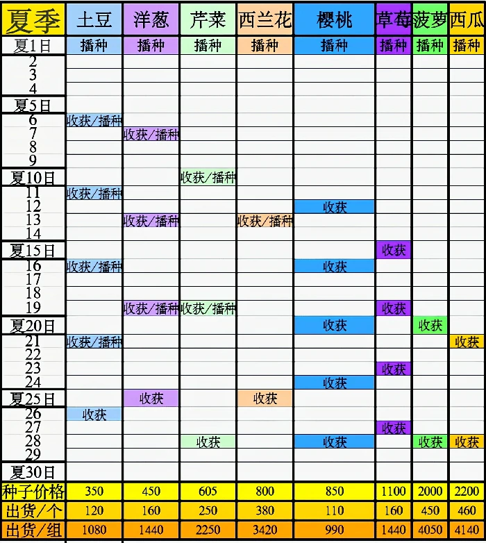 综合分析:夏季收益最高作物为菠萝,季度收获2次,单块地纯利6100;秘银锄头开垦1垄地(15块)净利润91500。