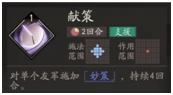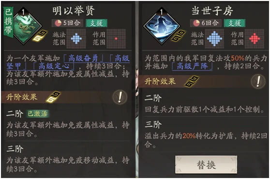 基础技能带单体+群体治疗,单体触发天赋,群体前期用,后期换大招当世子房;辅助技能献策提友军10%法术伤害,一般不选。