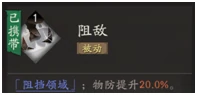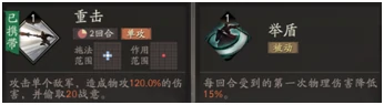 重击与举盾多数情况不推荐携带。曹洪不依赖重击战意削减,举盾每回合仅承担一次物理伤害,减伤有限,适用性低。技能阻敌更值得关注,生成阻挡领域(周围一格禁止通行),永久提20%物理防御,实战作用突出。