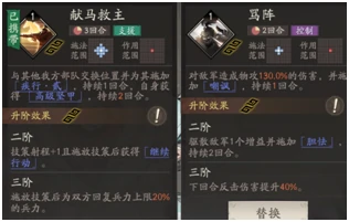 初始技能骂阵为单体控制技,施放范围小,升级后仅附加胆怯(降目标10%攻击)和提高反击伤害,实战价值有限,后期通常被大招献马救主替代。献马救主可与友军互换位置,提供疾行二(移动力+2),自身物理抗性升30%。升级后射程增1格,获再行动能力,为双方恢复兵力,是核心救援与生存技能。