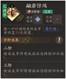 核心技能“翩若惊鸿”:战术价值强,赋予友军再行动,补充战意;升级延长增益回合,减少减益持续时间,必带。