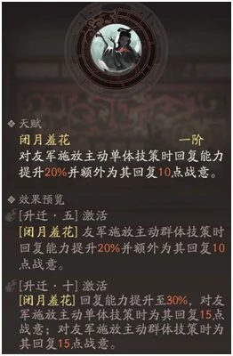 天赋“闭月羞花”:单体技能治疗量提升,额外恢复战意;五星后群体技能享加成;满星小幅提加成,五星够用,辅助无需急追满星;可搭配双单奶加被动,五星非硬性要求。