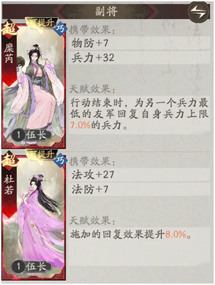副将:糜夫人最优,每回合额外群体治疗;另一选生存辅助武将,天赋无需治疗增强,自身治疗足够。