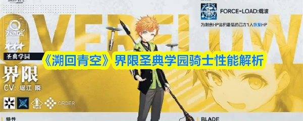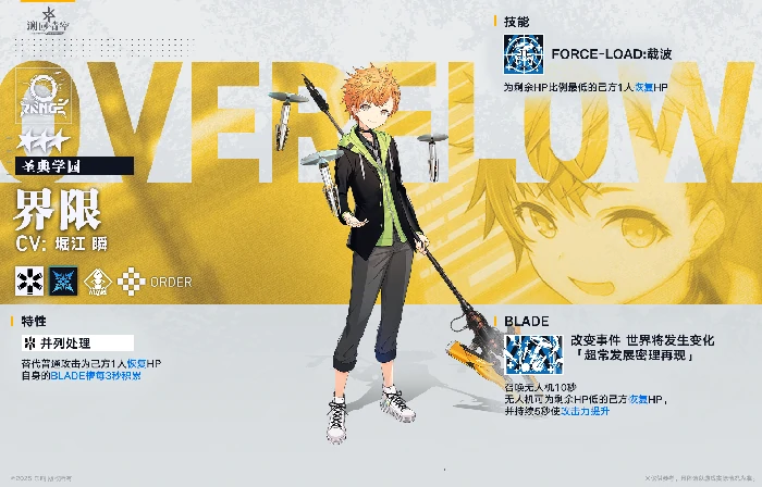 界限,圣典学园骑士,主打战术辅助。核心特性并列处理,搭配技能FORCE-LOAD:载波,实现多线程辅助,大幅提升队伍运转效率。终极技能BLADE:改变事件,发动即激活超常发展状态,直接重构战局,战略价值极高。