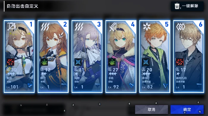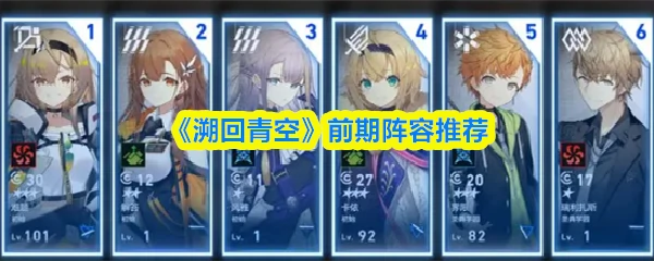 前期队伍搭配:选2输出+2回能+1治疗+1辅助。输出用难题(远程)或卡农(近战),治疗带界限,回能上解答(二星)和风雅(一星),辅助配雅利扎斯(二星)。按这套组,稳过前期关卡。
