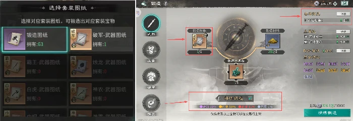 图纸选择:使用特殊指定图纸打造固定套装宝物,或用普通随机图纸随机获取套装。两种方式搭配精炼锻造,提高稀有宝物产出概率。