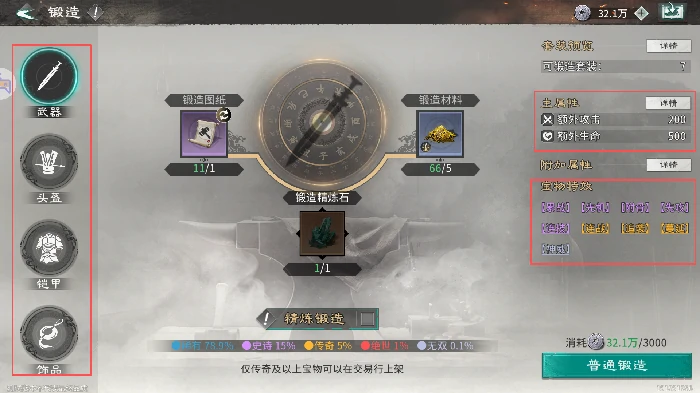 锻造分类:普通锻造消耗锻造图纸、基础材料和银币;精炼锻造额外加入精炼石,显著提高高品质宝物获取几率。