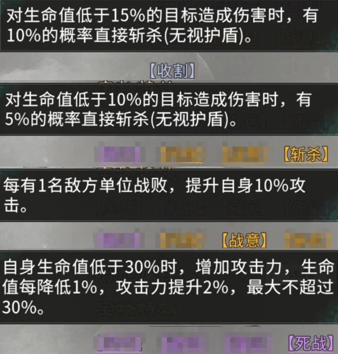 饰品特效建议选择收割或斩杀,有效终结敌人。本身具斩杀能力的武将(如吕布、关羽)优先选战意,紫色品质可选死战。