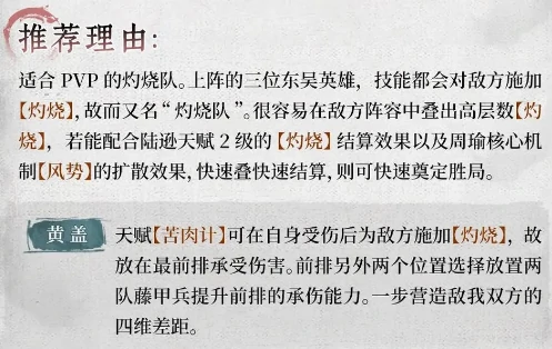 都督虎臣队:PVP灼烧核心阵容,黄盖前排承伤挂灼烧,陆逊结算伤害,周瑜风势扩散,快速叠加多层灼烧打爆发。