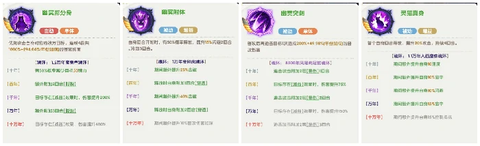 核心技能解析:幽冥影分身,单体输出技,优先对位攻击,四段高额伤害,短时间压制敌人;幽冥附体,被动增益,每回合提升闪避概率,增强生存,冷却短持续生效。