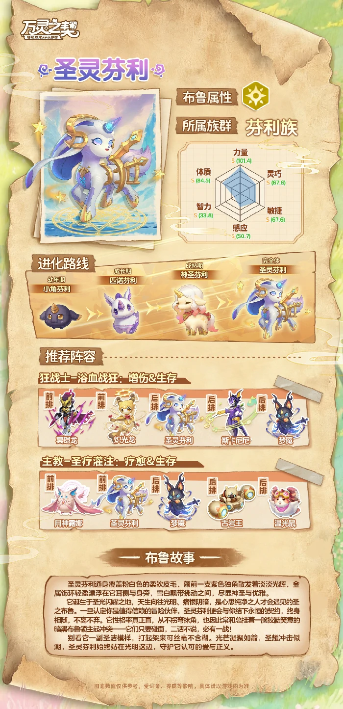 万灵之契圣灵芬利(芬利族布鲁)基础力量体质出色,进化后全方位提升能力,可依实战灵活切换前后排输出职责,多条进化分支提供丰富搭配策略。