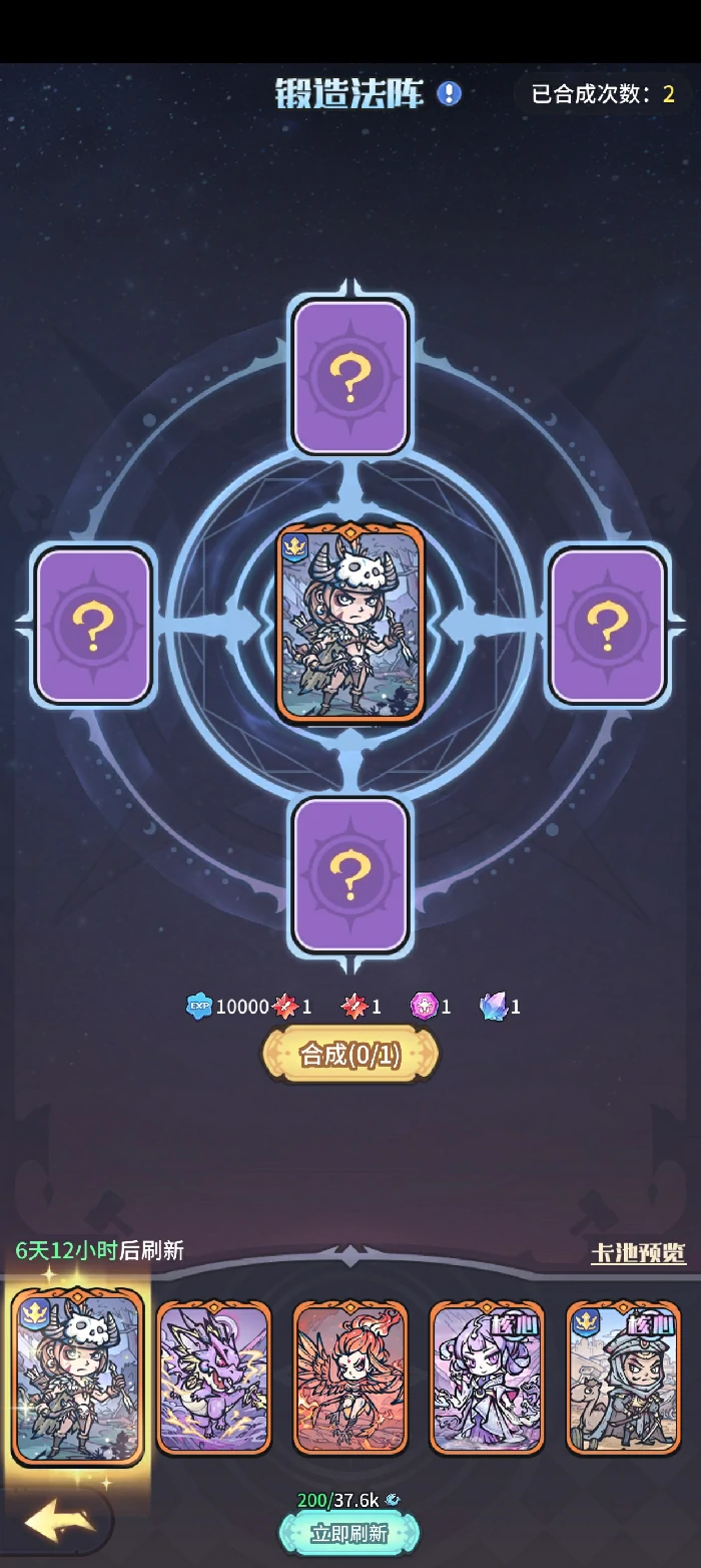 卡牌锻造要点:锻造为稳定获取卡牌途径,随等级提升解锁更多卡池。锻造核心卡牌后,可激活卡池保底机制助力后续抽取。锻造材料消耗随合成次数递增,优先锻造阵容核心卡。每次刷新仅需200资源,稳定产出两个核心,是重要的卡牌来源