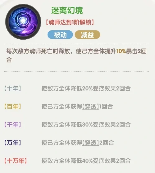 第一被动:敌方魂师被击败触发,我方全体暴击率提升,持续两回合,附加降低目标治疗效率状态,全体获穿透效果。穿透攻击护盾目标造成额外伤害,该伤害不受护盾抵消,克制治疗类魂师和防御型单位。
