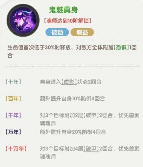 第二被动在普攻后,额外追击一名随机敌人。魂环提升后,增强破防能力,对兽武魂单位造成更高伤害。终极技能鬼魅真身在生命首次低于30%时触发,恐惧敌方全体一回合,大幅遏制输出,自身进入虚影状态,提升防御并为多个目标附加破甲。技能兼具自保与群体削弱,为后续爆发创造良好环境。