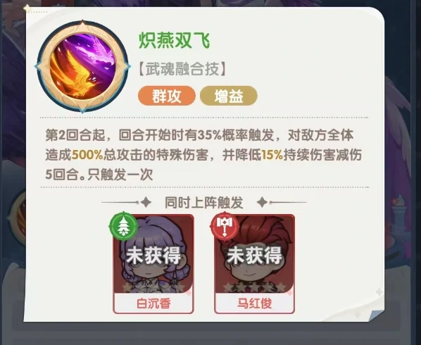第二被动踏燕,普通攻击随机选取目标,优先攻击敌方辅助系魂师,降低目标暴击抵抗,附加易伤状态。第三被动尖尾雨燕真身,首次施放主动技能后激活,提高全队速度,赋予暴击伤害加成,持续三回合,魂环提升后延长至五回合。