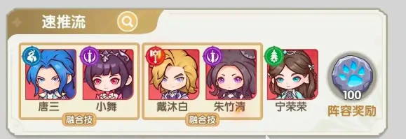 速推流用唐三、小舞、戴沐白、朱竹清、宁荣荣。唐三控制,小舞核心输出,戴沐白破甲并和朱竹清触发融合技,宁荣荣加速辅助。此组合推图和材料副本表现优异,适合新手玩家。