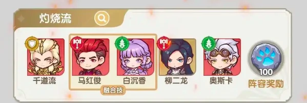 灼烧流选千道流、马红俊、白沉香、柳二龙、奥斯卡。奥斯卡主输出,马红俊与白沉香释放融合技。优先提升马红俊的凤凰啸天击和柳二龙的火龙真身技能。该阵容成本低、效果稳定,适合平民玩家长期培养。