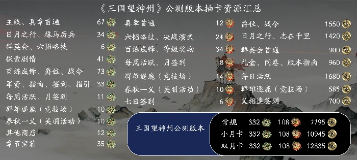 初期免费抽卡资源总量:7895金铢、332次绿抽、108次红抽。