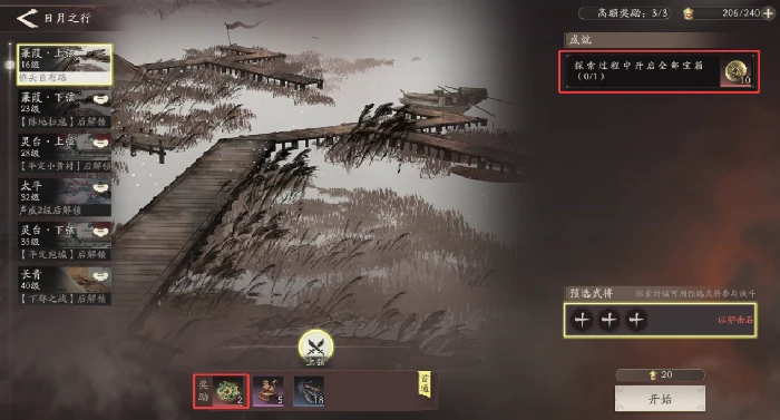 3、玩法副本奖励:挑战日月之行、志在千里、秣马厉兵等副本,达标领奖励。金铢1420(志在千里1120、日月之行300);绿抽34次(秣马厉兵5、日月之行29);玩法金铢绿抽红抽日月之行300(宝箱)29(首通+宝箱)——志在千里1120(首通)————秣马厉兵——5(首通)——合计142034——