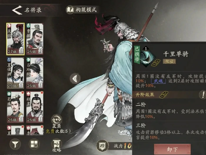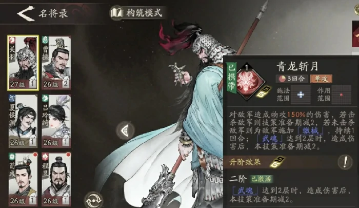 关羽技能细节与增益:青龙技能未完成击杀可施加缴械效果,使敌人无法进行普通攻击;武魂叠满状态下击败敌人刷新技能冷却时间;满级后获得额外移动格数,提高15%最终伤害;孤立状态下攻击与防御属性额外提升10%,增益显著。