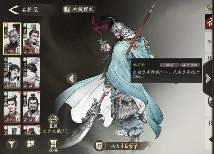 关羽技能特色解析:主动进攻触发额外行动;未击败目标激活拖刀技,降低主动技能冷却,增强反击伤害;击败敌人积累武魂,每层增5%伤害,最高叠加两层。