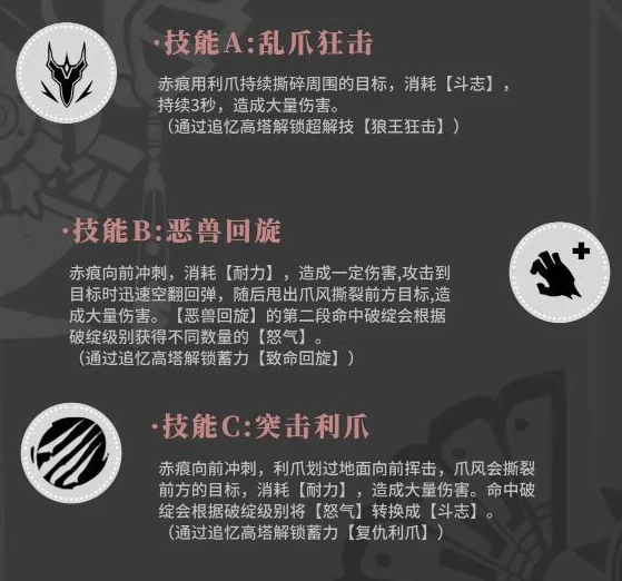解锁追忆高塔,赤痕技能强化:乱爪狂击进阶狼王狂击,消耗斗志对周围敌人造成持续3秒范围撕裂伤害,清场能力大幅提升。恶兽回旋追加致命回旋效果,突刺利爪解锁复仇利爪,每次升级显著提高输出效率。大招远古怒魂为团队增益技能,觉醒后发出咆哮,提升全队攻击欲望与攻击力系数,副本或Boss战为队伍带来一轮爆发输出。