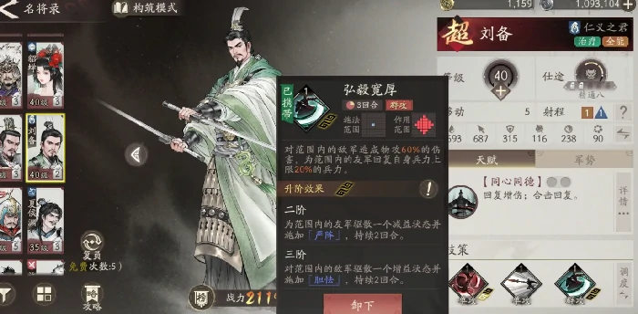 选刘备线?从布衣到仁德之君,看这里!刘备,统率出众全能主君,核心技能“弘毅宽厚”:范围伤(物攻60%)+全体回血(兵力上限20%)。