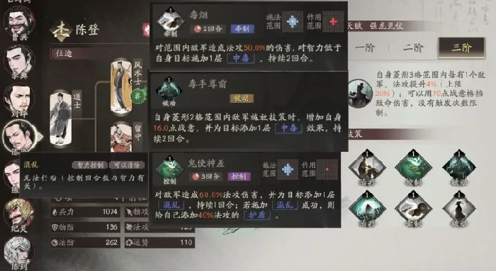 技能重点考虑毒烟、鬼使神差和毒手尊前。毒烟稳定施加中毒状态,对超品武将可能失效,适用于品级较低敌人。鬼使神差侧重控制与生存,较为均衡。毒手尊前为被动技能,根据范围内敌人数目提供战意增益,战意蓄满可额外行动,触发后对敌人附加中毒,周围多名敌军时配合天赋获得免死效果,辅助武将恢复战意可多次生效免死机制。