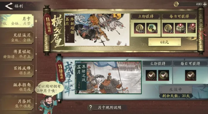 想氪金?先买月卡!一次性买,做日常、累计登录解锁奖励。月卡送聚财玉、铜钱,加速角色成长、物资积累。还送限定外观,比如武将皮肤,不加属性。