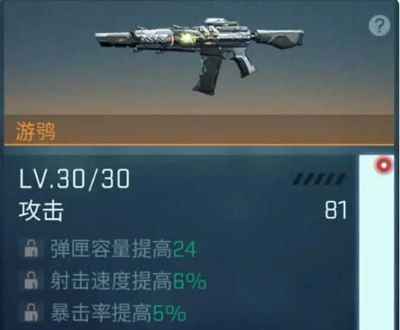 武器战力看四点:红色框内攻数值是基础,黄色框配件加距离、暴击。品阶越高,激活配件越多。