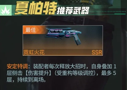 霓虹火花,夏帕特绝配武器。释放大招后,提升侧击伤害,最多叠加五层,效果持续至退场。侧击流、大招流,侧击均为主要伤害来源。叠满五层,侧击伤害质的飞跃,高养成度后期,输出更突出。