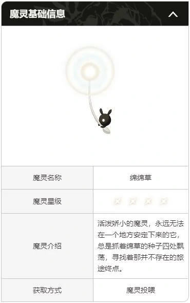 绵绵草是治疗辅助型魔灵,能恢复生命、提供防御辅助。通过魔灵投喂获取,编入队伍后,战斗时为主要角色回复30%生命值,额外加10%防御,效果持续15秒,技能冷却30秒。合理用它提升角色生存能力,适合新手。