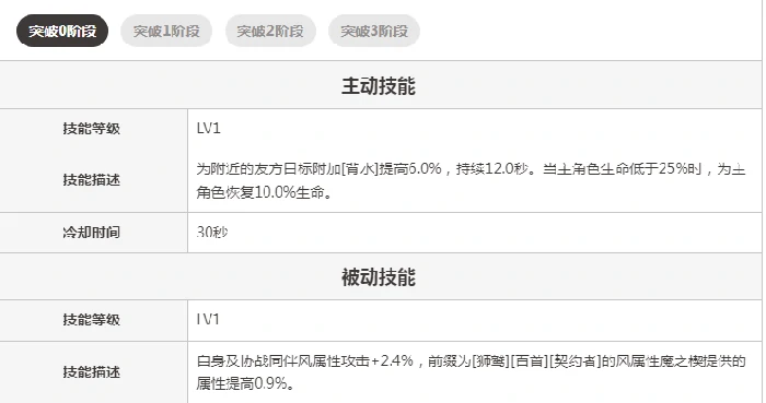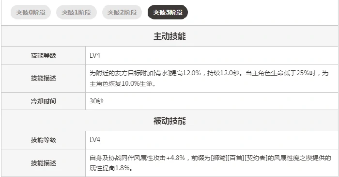 被动技能:提升自身与协战同伴风属性攻击,一级加2.4%,前缀为契约者或狮鹫的魔之楔额外加0.9%,最高可达4.8%。