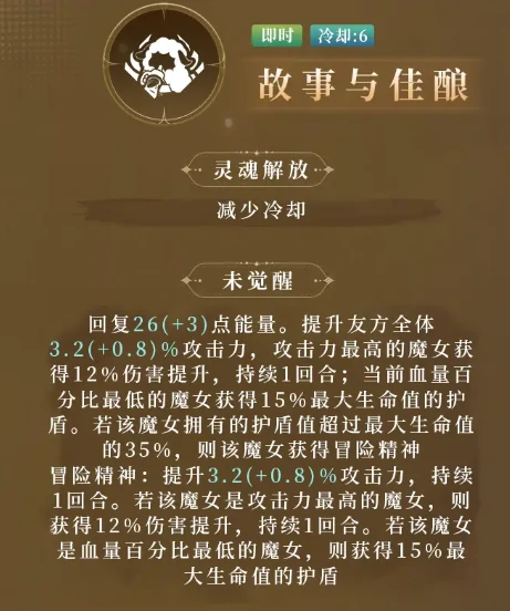 终极技能故事与佳酿具复合战术功能。未觉醒:使用后恢复自身26点能量,提高全队3.2%攻击力,攻击最高单位额外获12%伤害增益,持续一回合。同时,为生命值最低队友附加花梨最大生命15%的护盾;若护盾超目标最大生命35%,额外赋予目标一层3.2%基础攻击倍率的攻击加成。