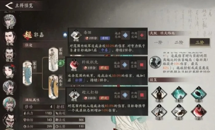郭嘉必带,被动天妒鬼才提全队伤害,计策溃逃群伤叠加持续伤害。优先培养,放关键位置,主打群体输出。