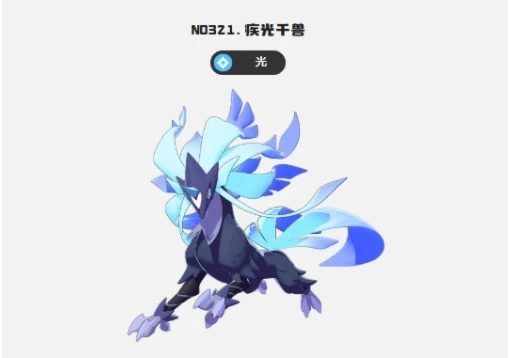 疾光千兽:光系功能型,夜间自发光。队伍有其他光系精灵时,全体光系成员攻击力提升10%。每次攻击给目标挂光印记,目标再受攻击触发额外伤害。主攻光系队伍必练,协同其他光系精灵,发挥可观战力。
